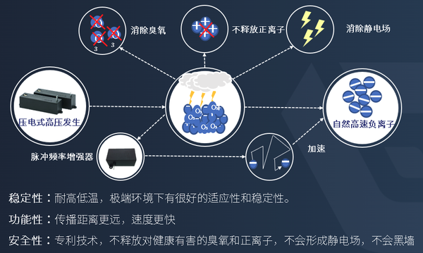 依托多项国内发明专利、国际发明专利及二十多项独有技术,沃壹健康成功突破行业长期存在的痛点,推出全新安全负离子解决方案,为健康呼吸标准赋予全新定义。 沃壹健康攻克了通过高压对空放电制造负离子的过程中有害衍生物的产生与释放技术瓶颈,完全实现在高浓度负离子释放同时,不会释放危害人体健康的臭氧、正离子,不形成静电场、无黑墙与静电打手现象,同时控制电离辐射值趋近于环境本底。